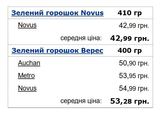 Этот продукт представлен только в Novus по указанной средней цене. В то же время "Зеленый горошек Верес" объемом 400 граммов подорожал со средних 50,90 грн в апреле до 53,28 грн сейчас. Дешевле всего его можно приобрести в Auchan за 50,90 грн, в Metro цена составляет 53,95 грн, а в Novus – 54,99 грн.