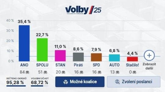 Наибольшая неудача постигла левопопулистский блок "Хватит!" (Stačilo!), сформированный чешскими коммунистами. Эта политическая сила получает всего 4,4% и не преодолеет 5-процентный проходной барьер в парламент.
