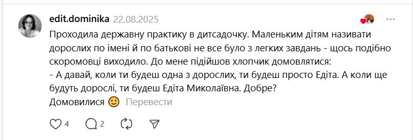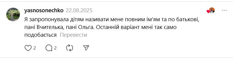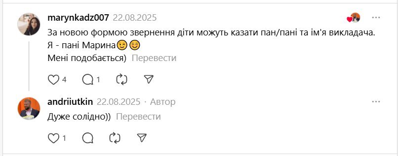 Учителя подчеркивают необходимость того, чтобы школьники воспринимали педагога не только как строгую фигуру власти, но и как партнера для общения. Подобные, на первый взгляд незначительные, изменения в культуре общения свидетельствуют о более масштабной трансформации украинской образовательной системы от строгих советских норм к современным европейским принципам взаимоотношений между учащимися и преподавателями.