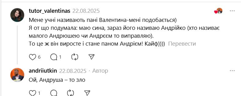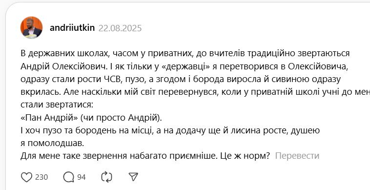 Педагог описал, как традиционное обращение по отчеству в госшколе заставило его почувствовать себя старше - выросли самомнение, появился живот, борода и седина. Переход на обращение "пан Андрей" или просто по имени в частной школе изменил его внутреннее состояние к лучшему, несмотря на сохранившиеся внешние признаки возраста.
