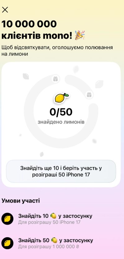 Monobank отпраздновал десятимиллионного клиента и по этому случаю запустил в своем приложении игру по поиску лимонов. Популярность акции превзошла все ожидания - уже в течение первых десяти минут десять тысяч пользователей собрали нужное количество лимонов, что вызвало серьезные проблемы с серверами.