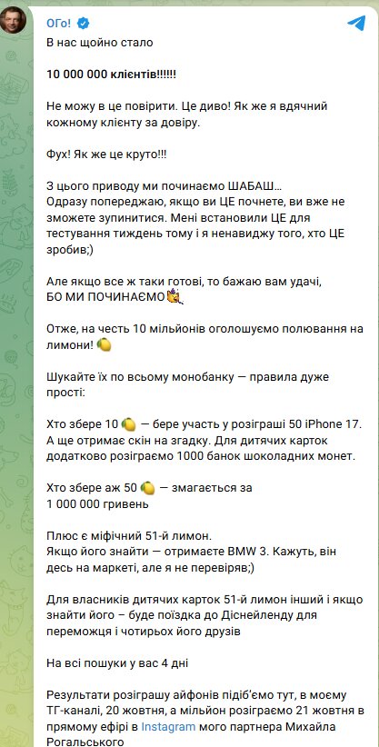 Промоакция продлится четыре дня. Победителей в розыгрыше iPhone 17 объявят 20 октября в Telegram-канале банка, а обладателя миллиона гривен определят на следующий день, 21 октября, в прямом эфире в Instagram одного из основателей Monobank Михаила Рогальского.