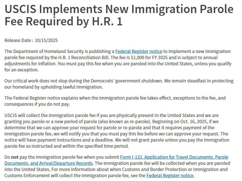 Начиная с 16 октября 2025 года американские иммиграционные службы ввели новый платёж в размере тысячи долларов. Его должны будут вносить люди, получившие временное разрешение на пребывание в США (так называемый parole), которое обычно выдаётся в гуманитарных ситуациях или при чрезвычайных обстоятельствах.