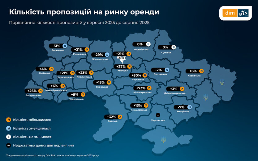 В сентябре предложений аренды стало больше почти во всех регионах страны. Самый заметный рост зафиксирован в Кировоградской области (+73%), хотя эксперты отмечают, что такая динамика связана с небольшим объемом рынка в этом регионе.