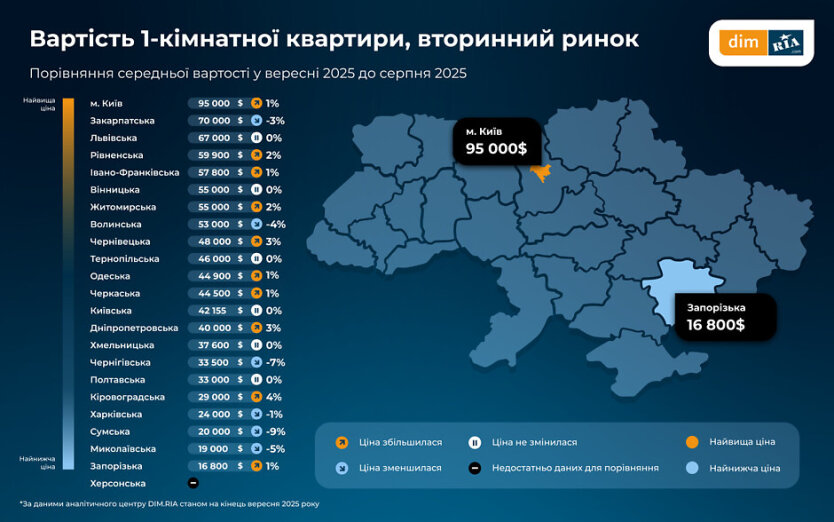 По данным DIM.RIA, соотношение количества объявлений о продаже и откликов на них в Киеве составляет 1:2, в то время как в Винницкой области этот показатель достигает 1:18, в Черновицкой - 1:17, а в Тернопольской - 1:16.