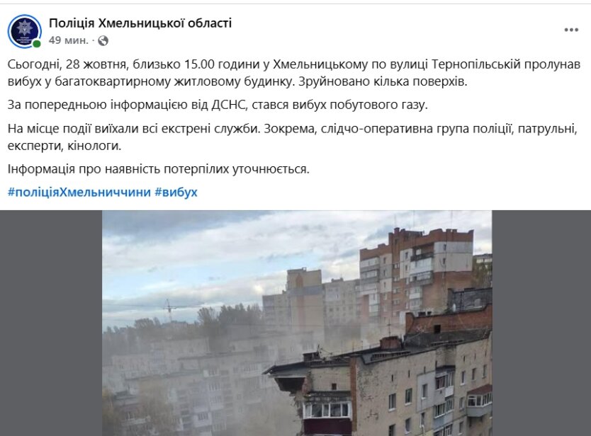В Хмельницком 28 октября около 15:00 произошел мощный взрыв в многоквартирном доме по улице Тернопольской, 34/2. По предварительной информации от ГСЧС и полиции области, причиной стала детонация бытового газа.