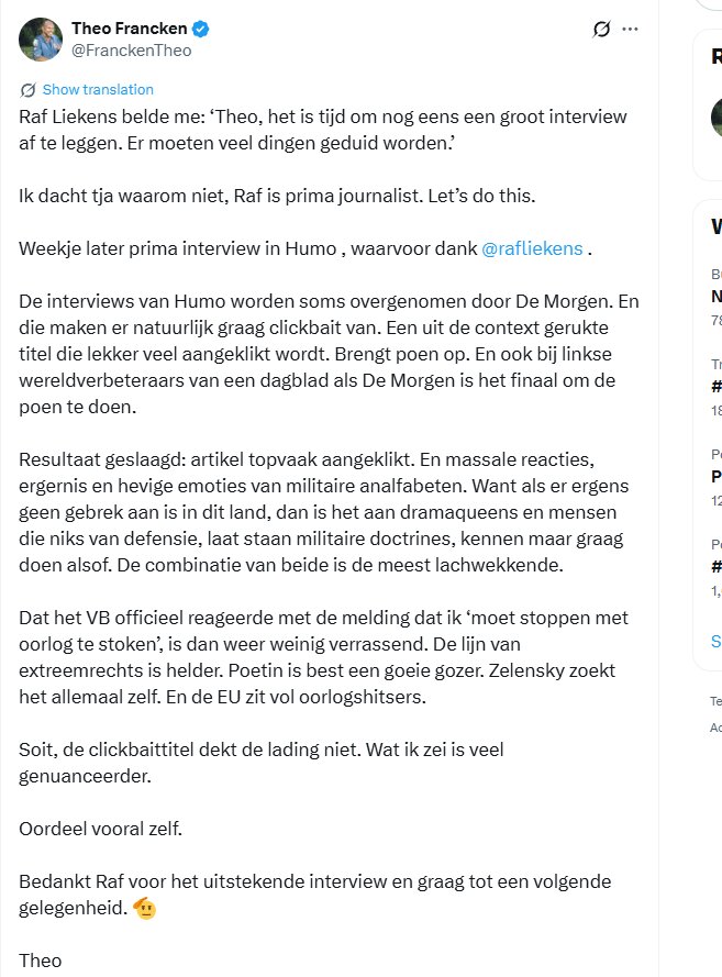 "Заголовок, вырванный из контекста, который получает кучу кликов. Это приносит деньги. И даже для левых благотворителей в такой газете, как De Morgen, все сводится к деньгам. Результат: успешная статья с кучей кликов. И массовые реакции, раздражение и сильные эмоции со стороны военных неграмотных", - написал он.