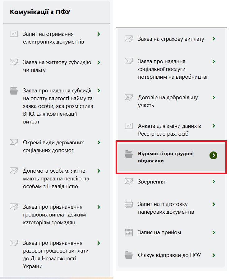 - Перейдите в раздел Коммуникации с ПФУ - Сведения о трудовых отношениях