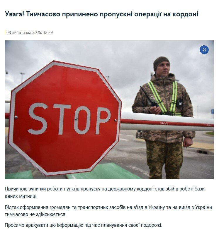 Из-за технического сбоя в работе базы данных таможни временно прекращено оформление граждан и транспортных средств на государственной границе Украины.