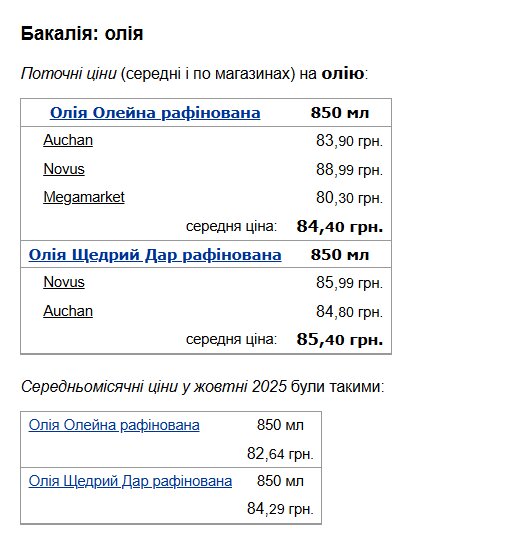 Подсолнечное масло также существенно подорожало за последний месяц. Рафинированное масло в объеме 850 миллилитров сейчас стоит в среднем от 84 до 85 гривен. Масло "Олейна" рафинированное продается по средней цене 84,40 гривны, тогда как "Щедрый Дар" рафинированное обойдется примерно в 85,40 гривны. Еще в октябре эти же позиции можно было приобрести дешевле - "Олейна" стоила около 82,64 гривны, а "Щедрый Дар" - примерно 84,29 гривны за аналогичный объем.
