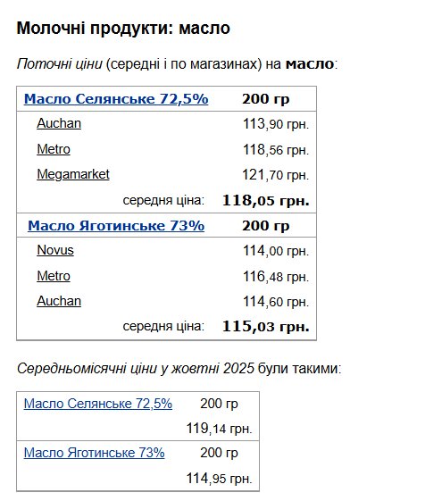 Наибольший ценовой удар пришелся на молочные продукты, в том числе сливочное масло. Пачка Селянского масла жирностью 72,5 процента весом 200 грамм сейчас стоит в среднем 118 гривен в различных торговых сетях. Яготинское масло с жирностью 73 процента продается по средней цене 115 гривен за такой же вес. По сравнению с октябрьскими показателями цены выросли достаточно ощутимо - Селянское масло тогда стоило примерно 119 гривен, а Яготинское - около 115 гривен за 200-граммовую пачку.