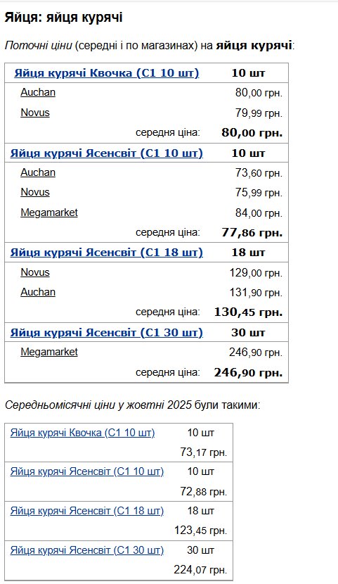 Для сравнения, среднемесячные цены в октябре были заметно ниже - десяток яиц "Квочка" стоил около 73 гривен, а "Ясенсвит" можно было найти за 72-73 гривны за десяток.