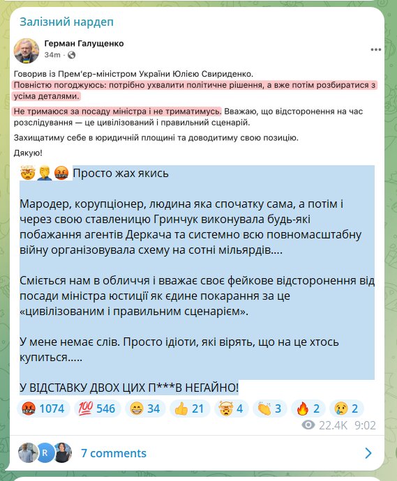 "Мародер, коррупционер, человек который сначала сам, а потом и через свою ставку Гринчук выполнял любые пожелания агентов Деркача и системно всю полномасштабную войну организовывал схему на сотни миллиардов. Смеется нам в лицо и считает свое фейковое отстранение от должности министра юстиции как единственное наказание за это "цивилизованный и правильный сценарий". У меня нет слов. Просто идиоты, которые верят, что на это кто-то купится. В ОТСТАВКУ ДВУХ ЭТИХ П***В НЕМЕДЛЕННО!". – добавил нардеп.