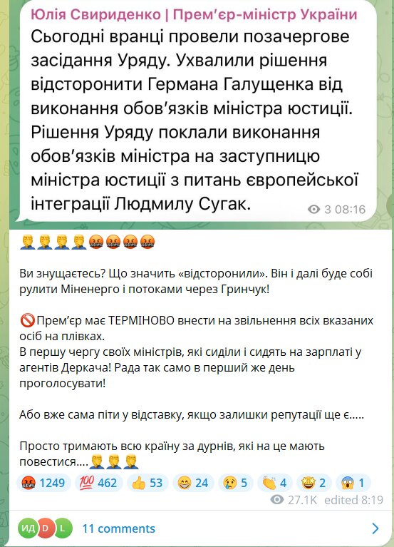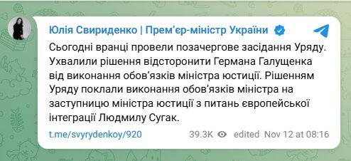 "Сегодня провели внеочередное заседание Правительства. Приняли решение отстранить Германа Галущенко от исполнения обязанностей министра юстиции. Обязанности министра временно будет исполнять Людмила Сугак", - написала премьер.