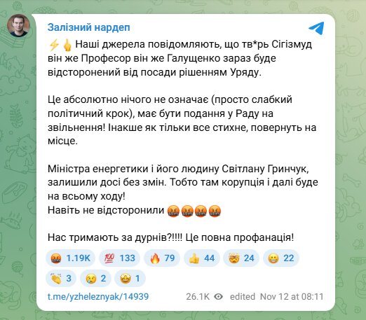 "Наши источники сообщают, что тв*рь Сигизмуд он же Профессор он же Галущенко сейчас будет отстранен от должности решением Правительства. Это абсолютно ничего не означает (просто слабый политический шаг), должно быть представление в Раду на увольнение! Иначе, как только все стихнет, вернут на место. Министра энергетики и его человека Светлану Гринчук, оставили до сих пор без изменений. То есть там коррупция и дальше будет на всем ходу!", - заявил он.