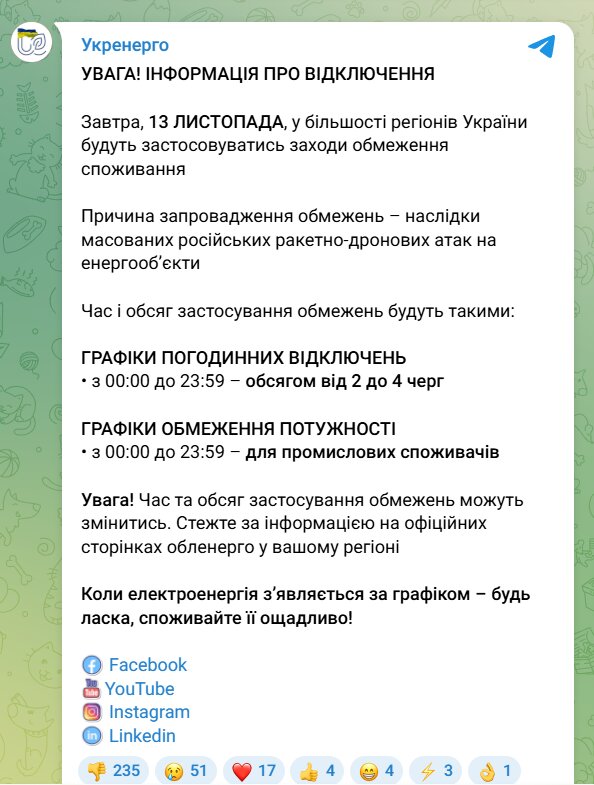 "Внимание! Время и объем ограничений могут измениться. Следите за информацией на официальных страницах облэнерго в вашем регионе Когда электроэнергия появляется по графику – пожалуйста, потребляйте ее бережно!", - говорится в сообщении.