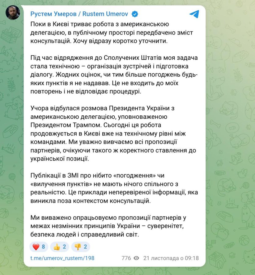 В частности, пресс-секретарь президента США Кэролайн Левитт заявила, что секретарь СНБО Украины Рустем Умеров выразил предварительное одобрение большинства пунктов во время переговоров.