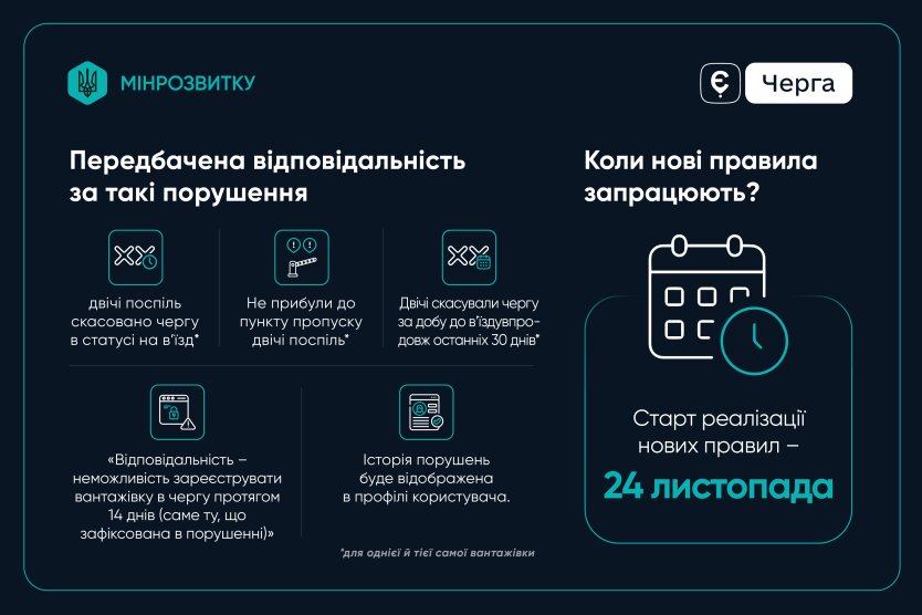 "Обновленные правила создают четкие механизмы дисциплины и ответственности. Эти инструменты позволят обеспечить стабильность очереди и равные условия для всех перевозчиков, как украинских, так и иностранных", — отмечают в Министерстве развития общин и территорий Украины.