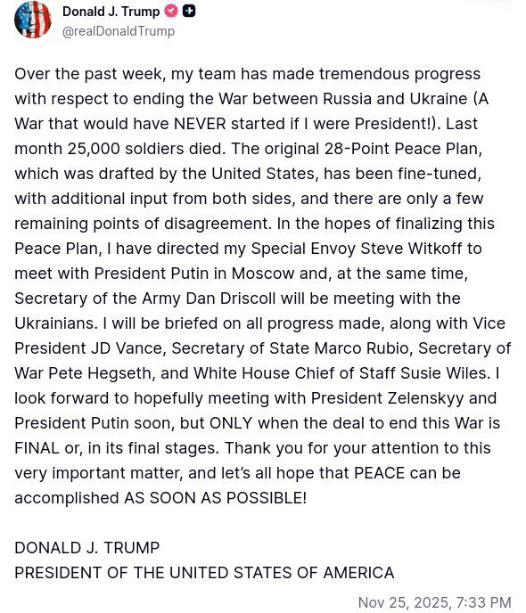 "За прошедшую неделю моя команда достигла огромного прогресса по прекращению войны между Россией и Украиной. В прошлом месяце погибли 25,000 солдат. Оригинальный 28-пунктный мирный план, который был разработан Соединенными Штатами, был доработан с дополнительными вкладами от обеих сторон, и осталось лишь несколько пунктов разногласий", — написал Трамп в своих соцсетях 25 ноября.