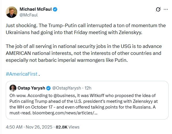 "Просто шокирует. Звонок Трампа и Путина прервал тот импульс, который был у украинцев перед встречей с Зеленским в ту пятницу. Задача всех, кто занимает должности в сфере национальной безопасности в правительстве США, состоит в том, чтобы продвигать американские национальные интересы, а не интересы других стран. Тем более не интересы варварских имперских разжигателей войны, таких как Путин", - написал Макфолл.