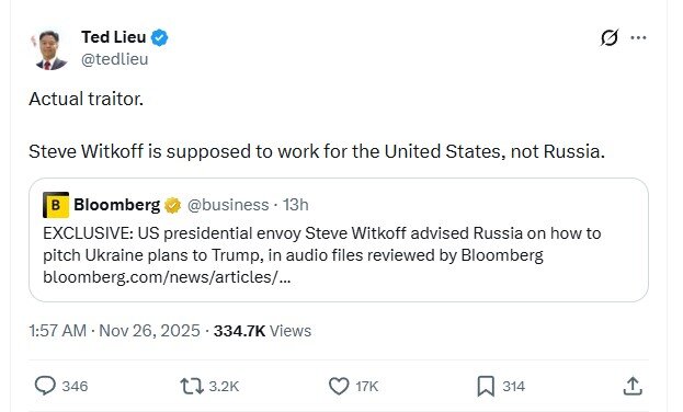 "Настоящий предатель. Стив Уиткофф должен работать на Соединенные Штаты, а не на Россию", - подчеркнул конгрессмен.