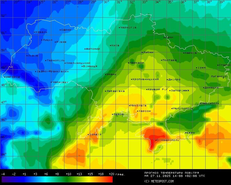 По словам Диденко, холоднее всего будет в четверг в западных областях, днем всего +2+6 градусов, а теплее всего в южной части, +12+16, в Крыму вплоть до +15+20 градусов.