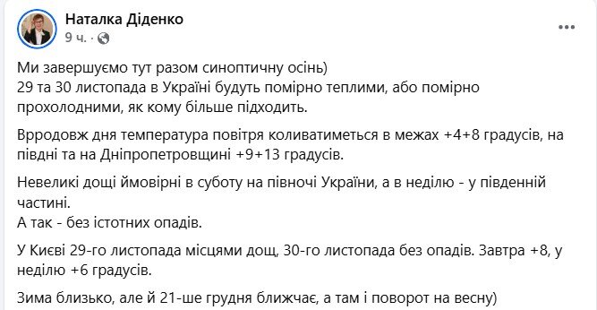 29 ноября ожидается преимущественно без осадков благодаря формированию поля высокого давления. По прогнозу Диденко, небольшие дожди вероятны в субботу на севере Украины, а в воскресенье — в южной части. Укргидрометцентр уточняет: 30 ноября и 1 декабря небольшой дождь прогнозируется на юге, Прикарпатье и Закарпатье из-за влияния атмосферного фронта от циклона над Черным морем.