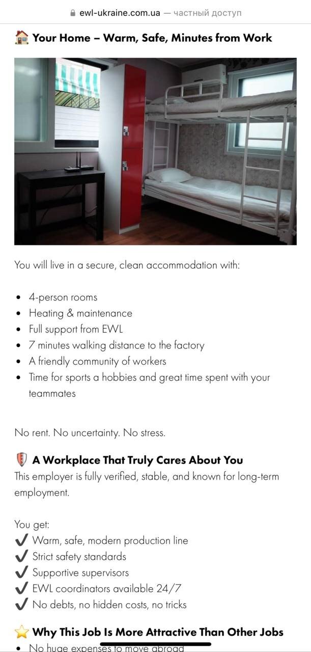 EWL подчеркивает, что вакансия предлагает "безопасное место для работы, стабильное место для жизни и гарантированный ежемесячный доход" в условиях, когда многие рабочие места исчезают, зарплаты меняются непредсказуемо, а условия труда могут быть небезопасными.