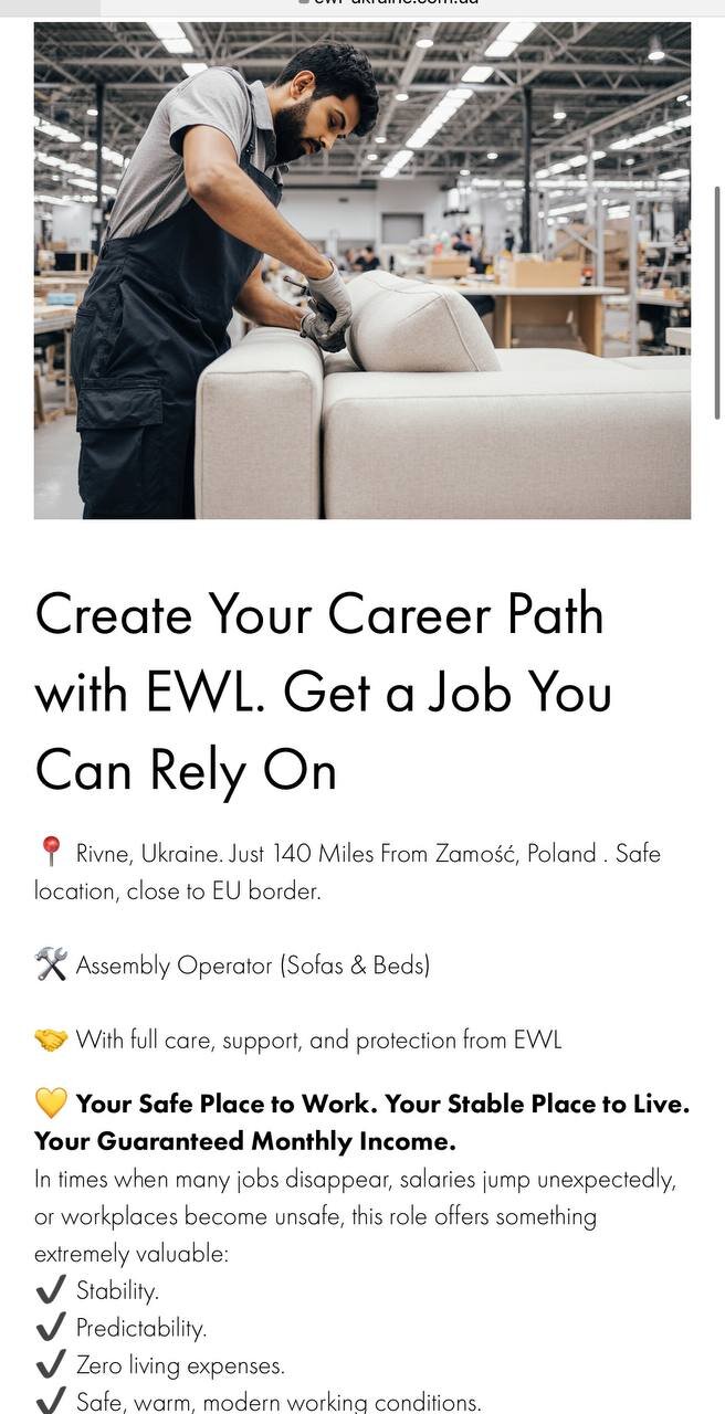 Польское агентство по трудоустройству EWL, имеющее представительство в Украине, опубликовало вакансии для работы в стране. Компания предлагает должности сборщиков мебели на производстве в городе Ровно, расположенном всего в 140 километрах от польского города Замосць.