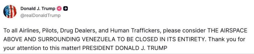 "Всем авиакомпаниям, пилотам, наркоторговцам и торговцам людьми, пожалуйста, обратите внимание, что воздушное пространство над Венесуэлой и вокруг нее закрыто. Благодарю вас за внимание к этому вопросу!", – говорится в его сообщении.