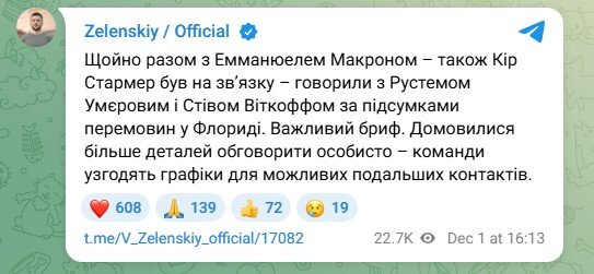 "Только что вместе с Эммануэлем Макроном – также Кир Стармер был на связи – говорили с Рустемом Умеровым и Стивом Уиткоффом по итогам переговоров во Флориде. Важен бриф. Договорилось больше деталей обсудить лично – команды согласуют графики для возможных дальнейших контактов", - уточнил Зеленский.