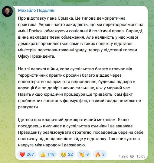Советник руководителя ОП Михаил Подоляк высказался об отставке руководителя Офиса Президента Андрея Ермака.