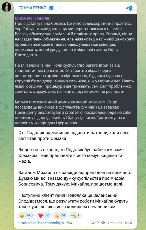 На его пост отреагировал нардеп Алексей Гончаренко, подчеркнул, что Подоляк также отказался "подавать патроны", когда весь мир восстал против Ермака.