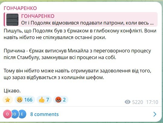 Нардеп также обратил внимание, что пишут о том, что Подоляк находился с Ермаком в глубоком конфликте. Они даже вроде бы не общались последние годы.