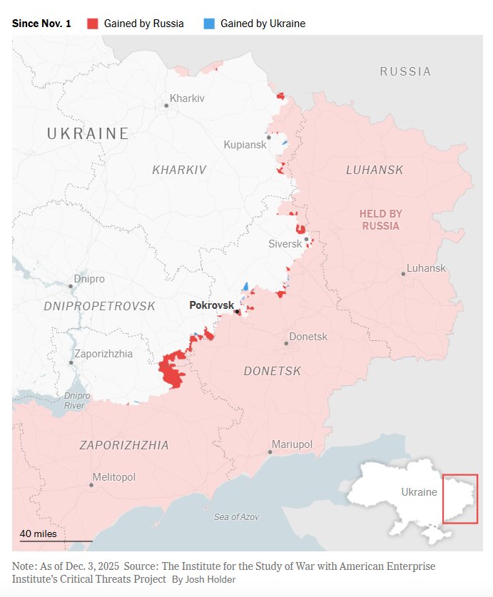 Россия усиливает давление на фронте на фоне активизации контактов по мирному плану – и пытается закрепить впечатление, что владеет инициативой, в частности вокруг Покровска. За несколько часов до встречи с американскими чиновниками в Москве Владимир Путин заявил о якобы захвате этого стратегического города после затяжных боев. Впрочем, ситуация там остается неоднозначной – по данным украинских военных и карт боевых действий, часть города все еще является спорной.