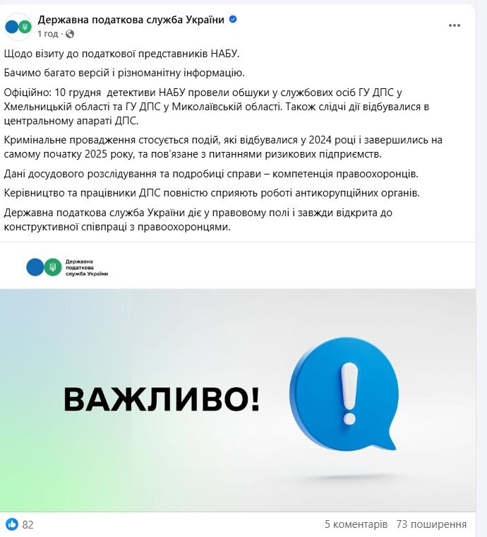 Однако спустя время ГНС Украины официально подтвердила, что 10 декабря детективы НАБУ провели обыски у должностных лиц ГУ ГНС в Хмельницкой области и ГУ ГНС в Николаевской области. Также следственные действия проходили в центральном аппарате ГНС.