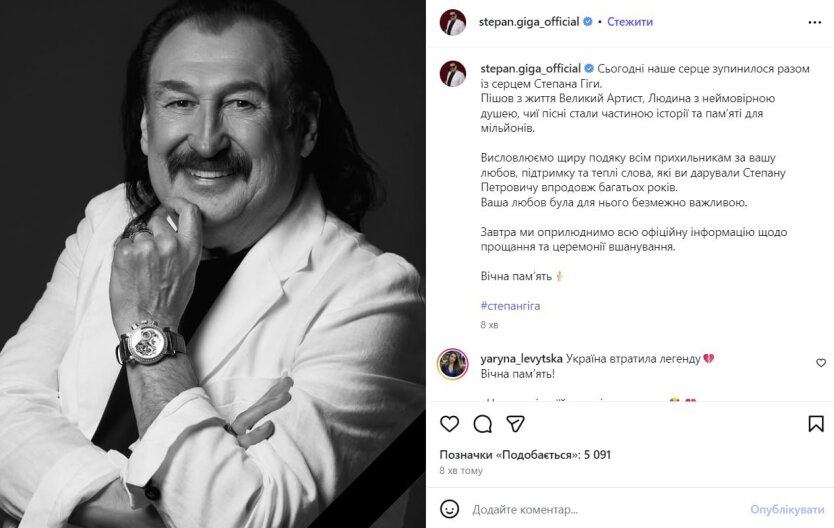 Позже смерть Степана Гиги официально подтвердили на его странице: "Сегодня наше сердце остановилось вместе с сердцем Степана Гиги. Ушел из жизни Великий Артист, Человек с невероятной душой, чьи песни стали частью истории и памяти для миллионов.