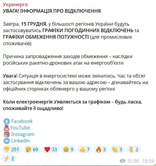 "Время и объем применения отключений по вашему адресу – узнайте на официальных страницах облэнерго в вашем регионе Когда электроэнергия появляется по графику – пожалуйста, потребляйте ее бережно!", - призвали украинцев.