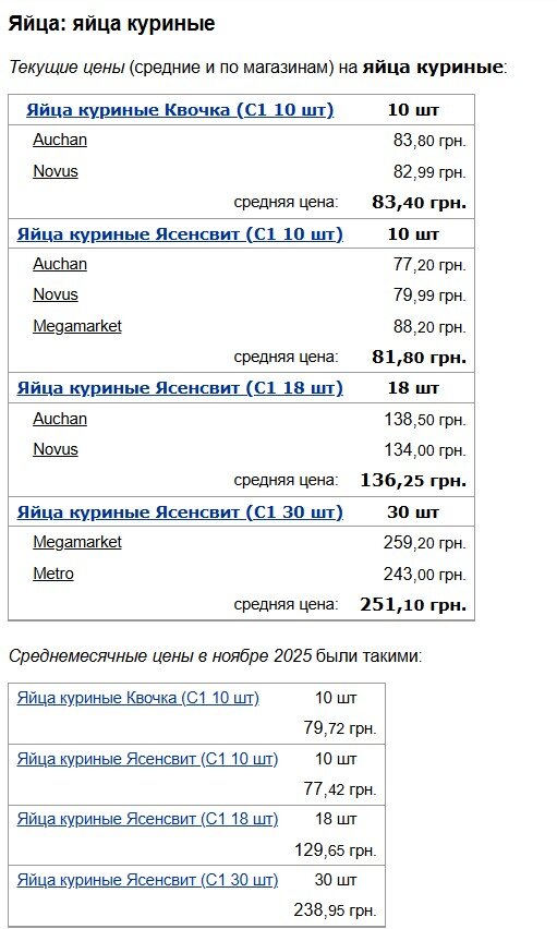 По данным Министерства финансов, по состоянию на 14 декабря 2025 года средняя цена фасованной упаковки куриных яиц категории С1 составляет от 81,80 до 83,40 гривны за десяток. При этом в торговых сетях можно найти как более доступные предложения, так и варианты стоимостью 80-90 гривен в зависимости от бренда и категории.