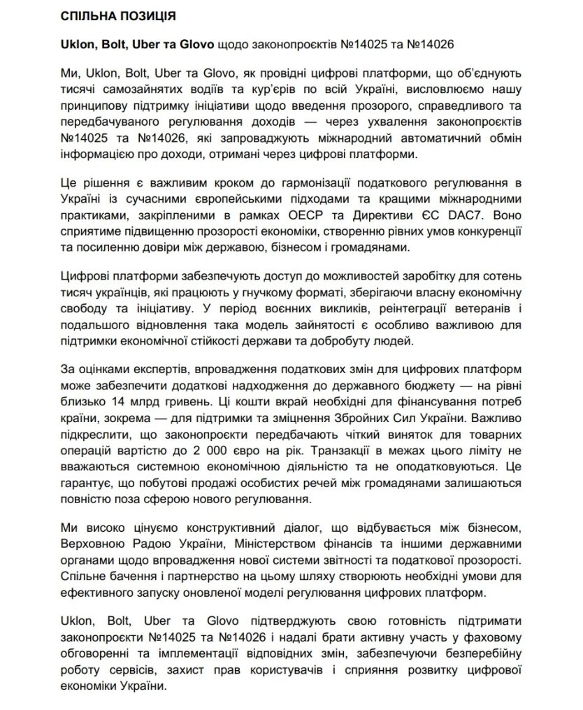 Сервисы Uklon, Bolt, Uber и Glovo заявили о поддержке правительственных законопроектов №14025 и №14026, которые предусматривают введение обмена информацией о доходах, полученных через цифровые платформы.