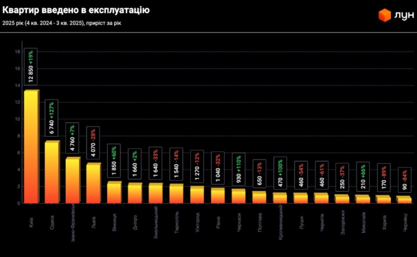 Активными были и регионы: застройщики Львовской области сдали 0,76 миллиона квадратных метров жилья, а Одесской - 0,61 миллиона, что даже превышает показатель всего 2024 года.