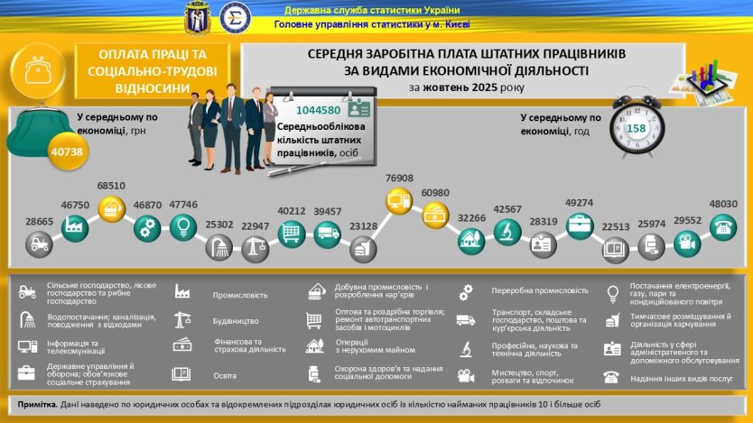 По итогам октября средняя заработная плата в столице достигла 40738 гривен, что на 627 гривен (1,5%) превышает показатель сентября. Для сравнения: по всей Украине этот показатель составил 26913 гривен, увеличившись на 290 гривен по сравнению с предыдущим месяцем (+1,1%).