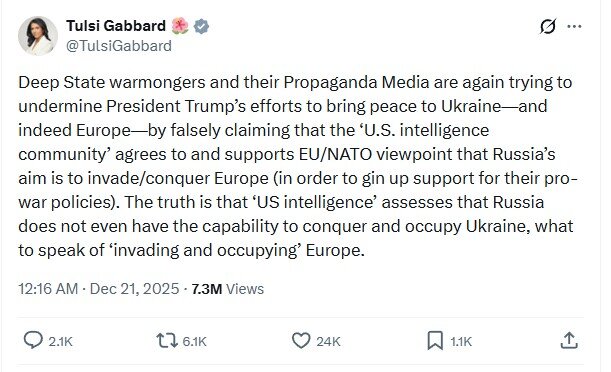 Габбард обвинила в своем заявлении "глубинное государство" и "пропагандистские СМИ" в попытках подорвать усилия президента Дональда Трампа по установлению мира в Украине. Якобы, те распространяют ложную информацию, что разведка США поддерживает оценки ЕС и НАТО, согласно которым целью России является завоевание не только всей Украины, но и Европы.