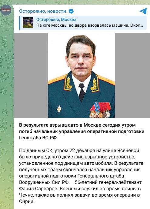 В Москве в понедельник утром, 22 декабря, в результате подрыва автомобиля погиб начальник управления оперативной подготовки Генерального штаба Вооруженных Сил РФ генерал-лейтенант Фанил Сарваров.