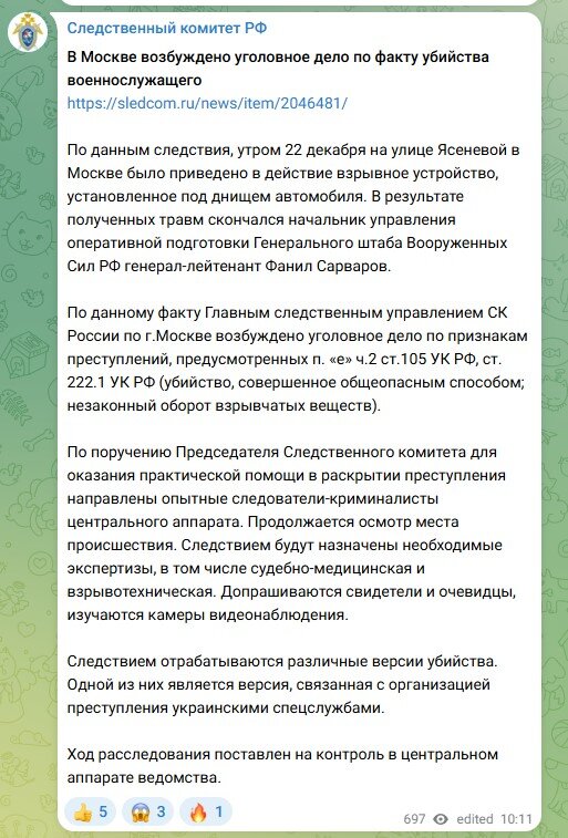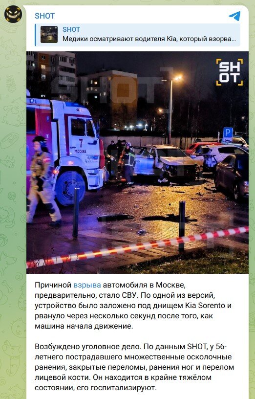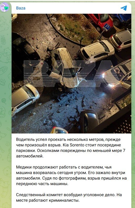 Телеграм-канал Shot, связанный с правоохранительными органами, сообщал, что по одной из версий взрыв произошел через несколько мгновений после того, как Kia Sorento тронулась с места.