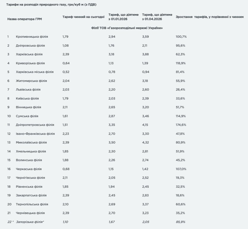 Средневзвешенный тариф операторов газораспределительных сетей для небытовых потребителей с 1 января составит 2,3 грн за куб м в месяц (с НДС), а с 1 апреля – 2,72 грн за куб м в месяц (с НДС). Как отмечает “Газправда”, с 1 апреля это означает рост в среднем на 60,5%.
