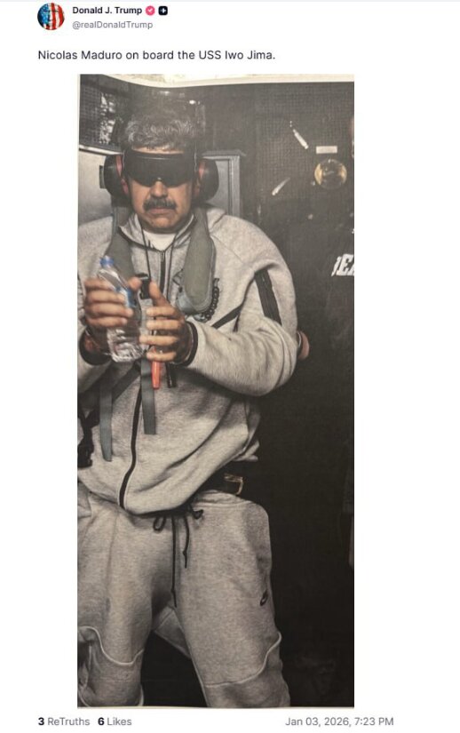Сейчас Николас Мадуро и его жена ожидают американского правосудия. Трамп также предупредил других политических деятелей Венесуэлы, что судьба Мадуро может постигнуть и их, если они будут оказывать сопротивление. При этом президент США отметил, что Вашингтон готов ко "второй, более мощной атаке", но пока не видит в ней необходимости.