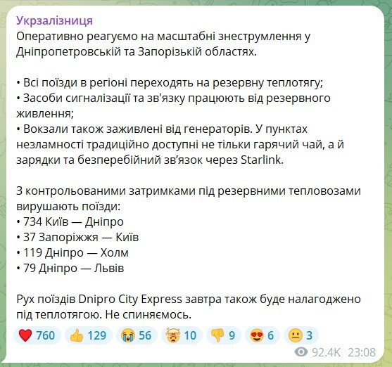 "Укрзализныця" оперативно перешла на план "Б". В обесточенном Днепре и регионе поезда курсируют под тепловозами (резервная теплотяга). Вокзалы работают на генераторах, однако пригородное сообщение электричек временно приостановлено.