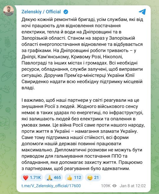 "И важно, чтобы наши партнеры в мире реагировали на это издевательство России над людьми. Никакого военного смысла нет в таких ударах по энергетике, по инфраструктуре, которые оставляют людей без электричества и отопления в условиях зимы. Это война России против нашего народа, против жизни в Украине – попытка сломать Украину. Именно поэтому поддержание нашей устойчивости, все формы помощи нашему государству должны работать максимально. Дипломатические разговоры не могут являться поводом для торможения поставок ПВО и оборудования, которое помогает защите жизни. Работаем с партнерами, чтобы реагирование было адекватным", - резюмировал глава государства.