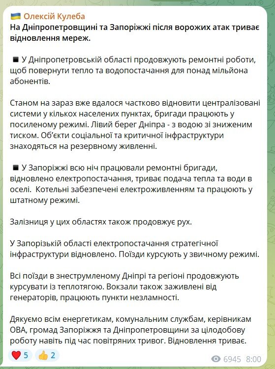 "Благодарю каждую ремонтную бригаду, все службы, которые с ночи работают для восстановления поставок электричества, тепла и воды на Днепровщине и в Запорожской области", - отметил он.